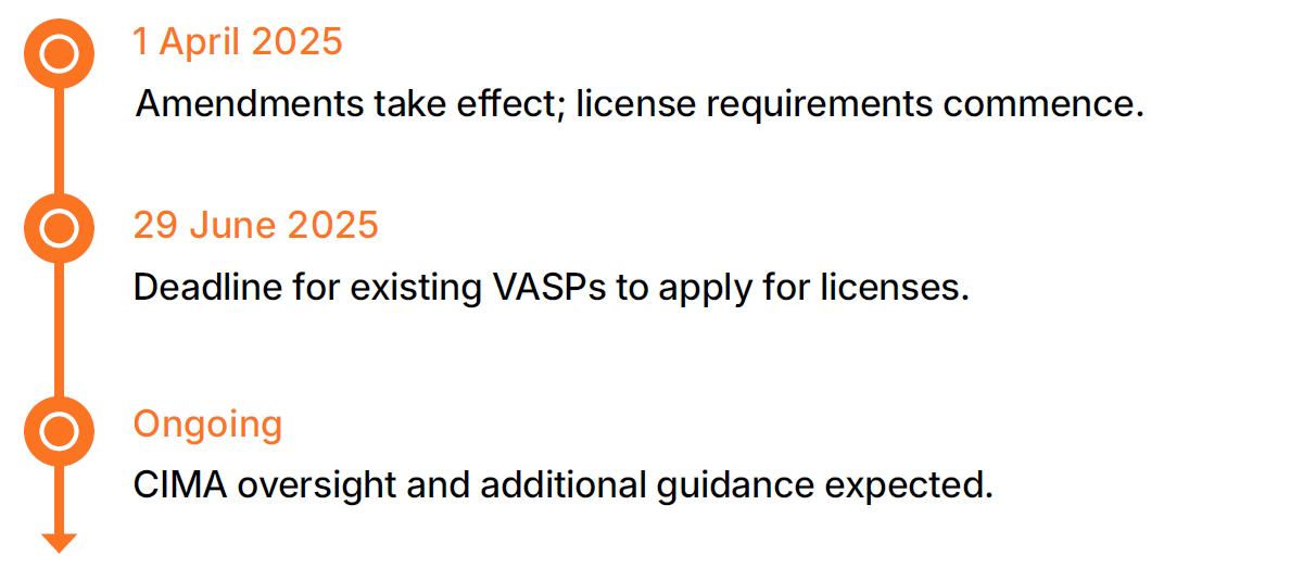 Effective 1 April 2025, the Cayman Islands’ updated VASP rules require licensing for virtual asset custodians and trading platforms, strengthen governance and registration requirements, and align the regime with global AML, cybersecurity, and consumer protection standards.