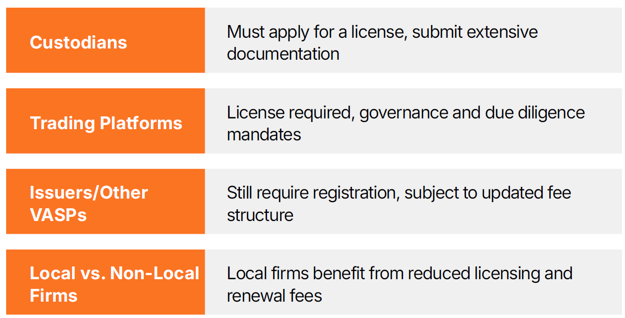 ●All Other VASPs: Entities engaged in issuance or transfer of virtual assets still require registration under the Act.