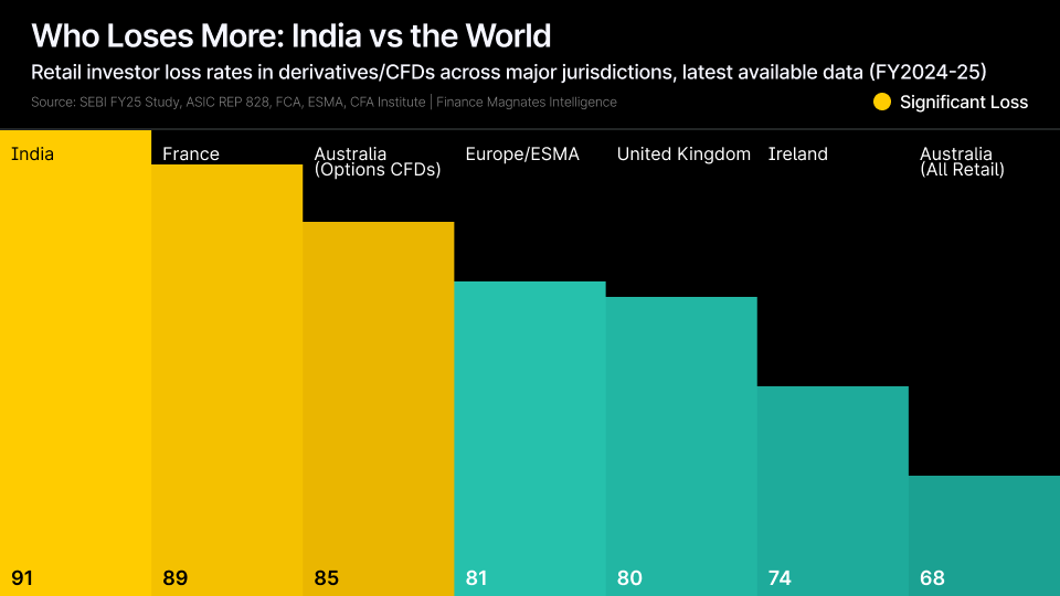 The gap is striking because India's products carry lower leverage than OTC CFDs - suggesting that when Western regulators start tracking exchange-traded derivatives outcomes, the numbers may be equally bad.