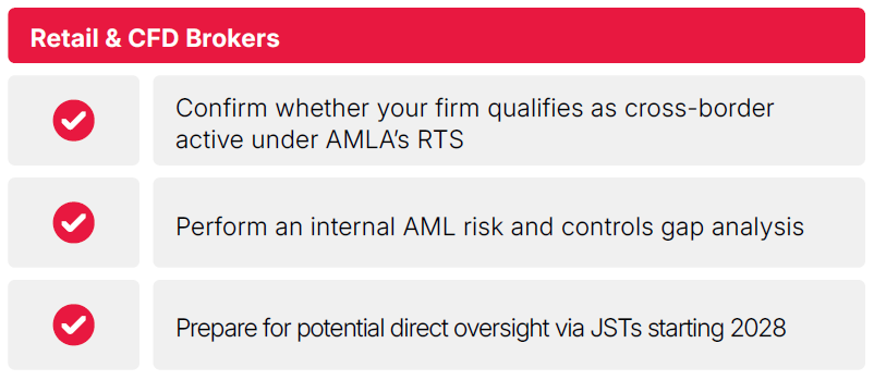 | Cross-Border FX/CFD Brokers | Potential direct supervision if active in ≥ 6 EU states with significant flows. Must comply with uniform AML rulebook and pass risk profiling. |