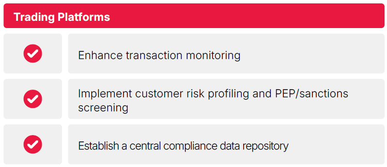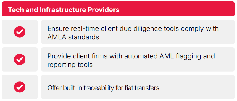 | Tech Providers | Expected to implement AML/CFT controls and support clients’ monitoring/reporting functions. |