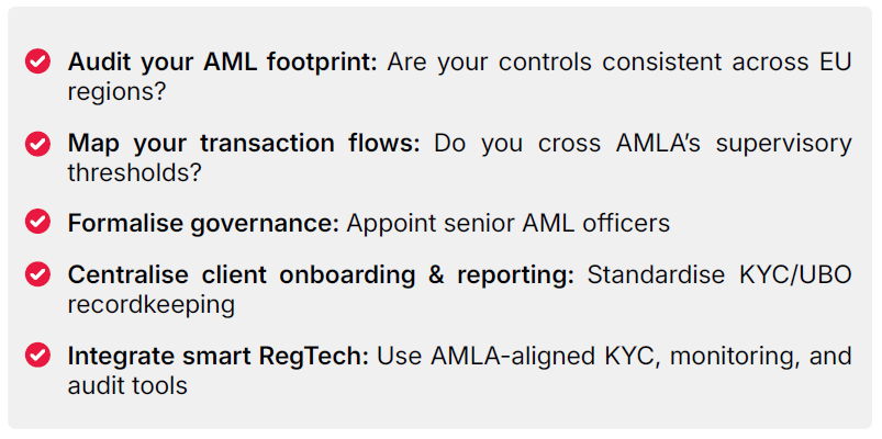 This update requires regulated firms to strengthen their AML frameworks, governance systems, and cross-border compliance operations—or risk exposure to supervisory action by either national authorities or AMLA directly.