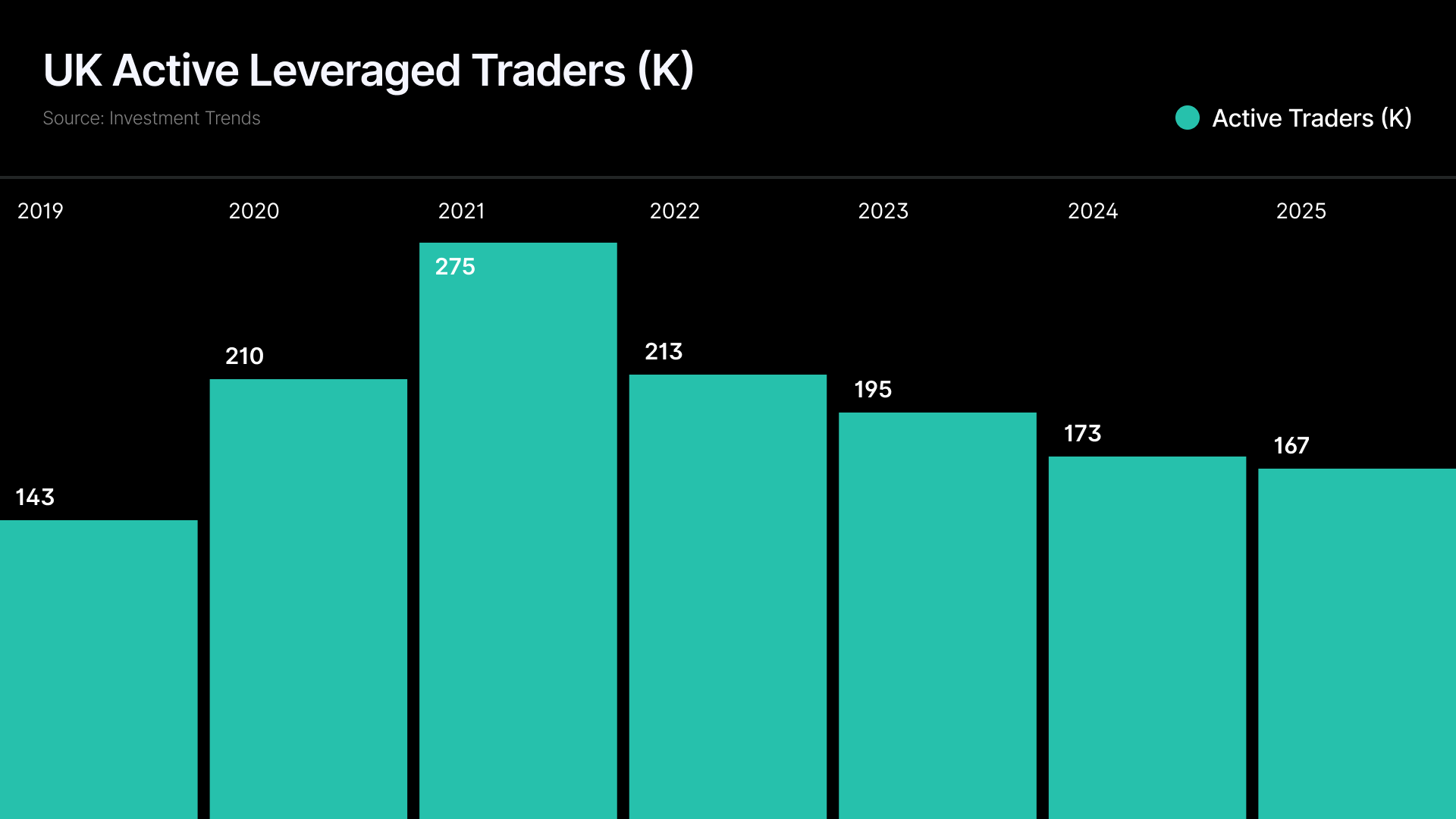 IG Group posted GBP 1.076 billion in fiscal year 2025 revenue, up 9% year-on-year. CMC Markets reported GBP 340 million in net operating income. Plus500 generated $792 million globally. Yet the UK leveraged trader population contracted 39% from its 2021 peak of 275,000 to approximately 167,000 in 2025, according to Investment Trends data.