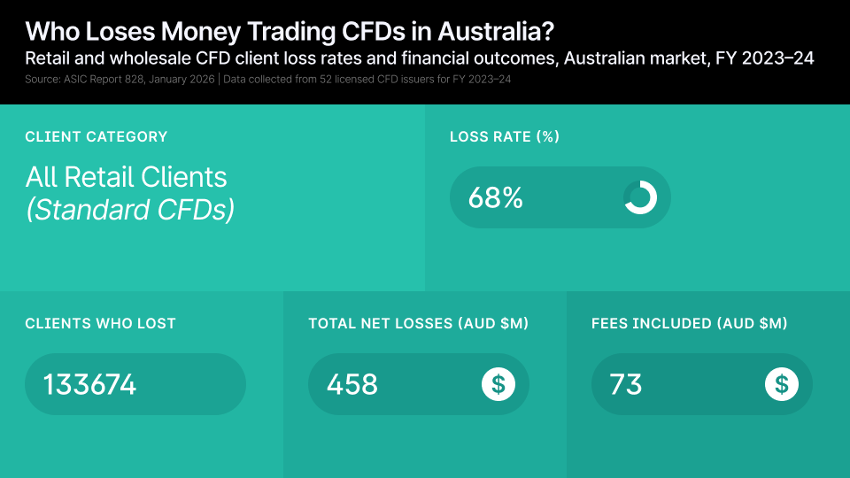 The client trading data ASIC collected paints a stark picture of retail outcomes. In the 2023–24 financial year, 133,674 retail clients lost money trading CFDs - representing 68 percent of all retail clients across the 52 issuers reviewed. Their combined net losses exceeded AUD $458 million, of which $73 million was attributable to fees.