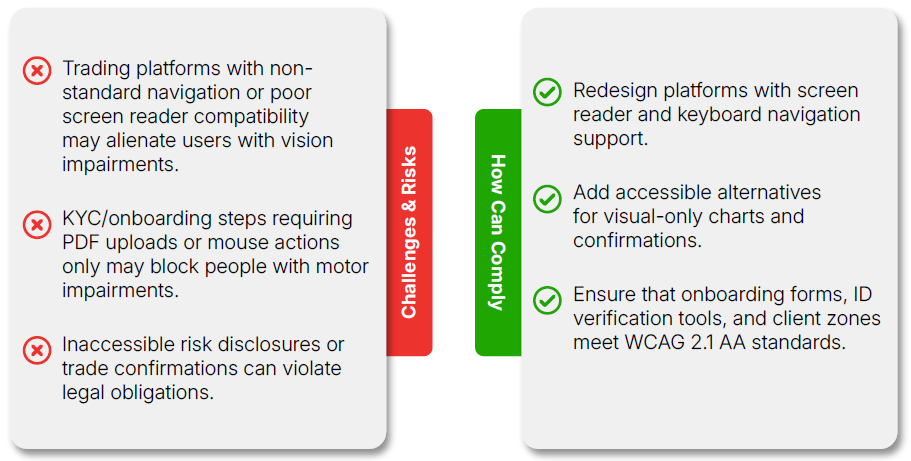 Key Impact: Brokers must ensure that trading terminals, client areas, onboarding flows, and research tools are fully accessible to traders with disabilities.