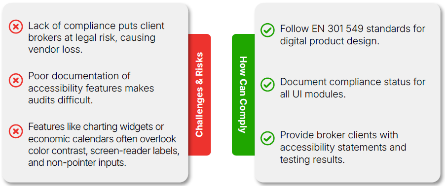 Key Impact: Vendors offering white-label trading software, analytics dashboards, payment systems, or user portals must embed accessibility features in core product design.