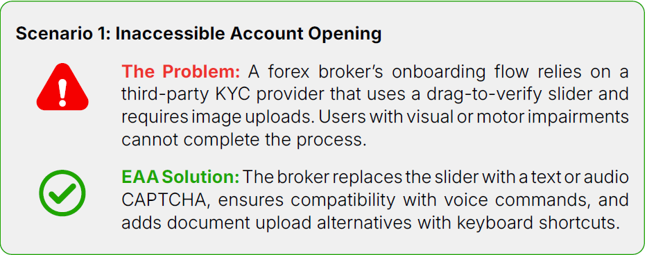 Example: A retail trader who is blind cannot complete onboarding because the platform uses a CAPTCHA that lacks audio alternatives. The broker risks legal complaints and user loss. Under the EAA, the broker must deploy inclusive forms and validation tools with accessible alternatives.