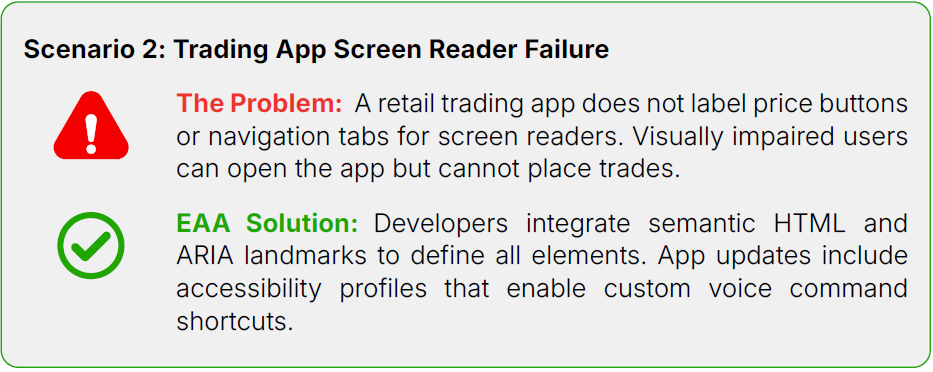 Example: A mobile-only investing app relies on animated sliders and drag-and-drop portfolio management. A user with Parkinson’s disease struggles to use it. The company introduces accessibility modes with larger buttons, voice commands, and keyboard alternatives to meet the EAA requirements.
