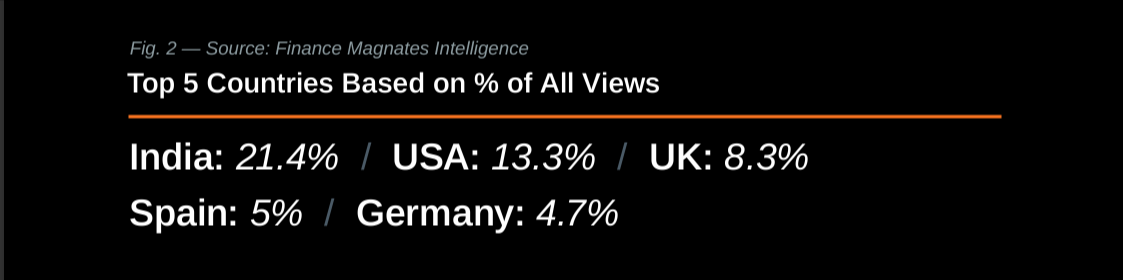 The APAC region lost its market share dominance in internet traffic to CFD brokers' websites, falling to 36.7% in Q3 2025, allowing Europe to regain the top position with 37.7% for the first time since 2023. This unexpected shift was primarily caused by the major impact of Exness stopping the onboarding of new Indian clients in Q2, which reshaped the viewership figures, as India remains the largest component of the APAC region in this analysis. Overall viewership continued to decline throughout Q3 2025, falling from 112.3 million views in July to 91.7 million in September.