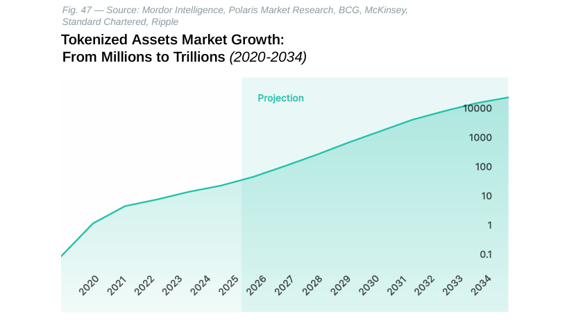 Industry projections suggest this is merely the beginning of a multi-trillion-dollar transformation. McKinsey estimates the tokenized market could reach $2–4 trillion by 2030, while more aggressive projections from Ripple and BCG forecast $18.9 trillion by 2033. Standard Chartered’s long-term outlook anticipates the market reaching $30 trillion by 2034.