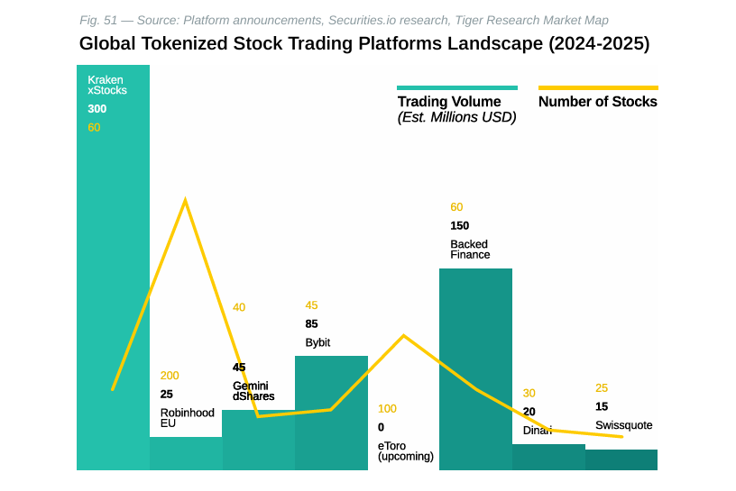 In retail trading, cryptocurrency exchanges have become the primary venues for tokenized stock trading, with major platforms launching comprehensive offerings throughout 2024 and 2025. Kraken’s xStocks platform, developed in partnership with Backed Finance, achieved over $300 million in trading volume within four weeks, demonstrating significant market appetite.