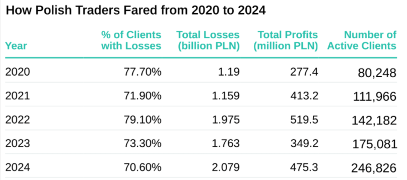 The number of active investors in the Forex market in Poland increased by 40% in 2024, reaching nearly 117,000 participants, while total losses simultaneously rose by 18% to a staggering 1.29 billion zlotys ($325 million).