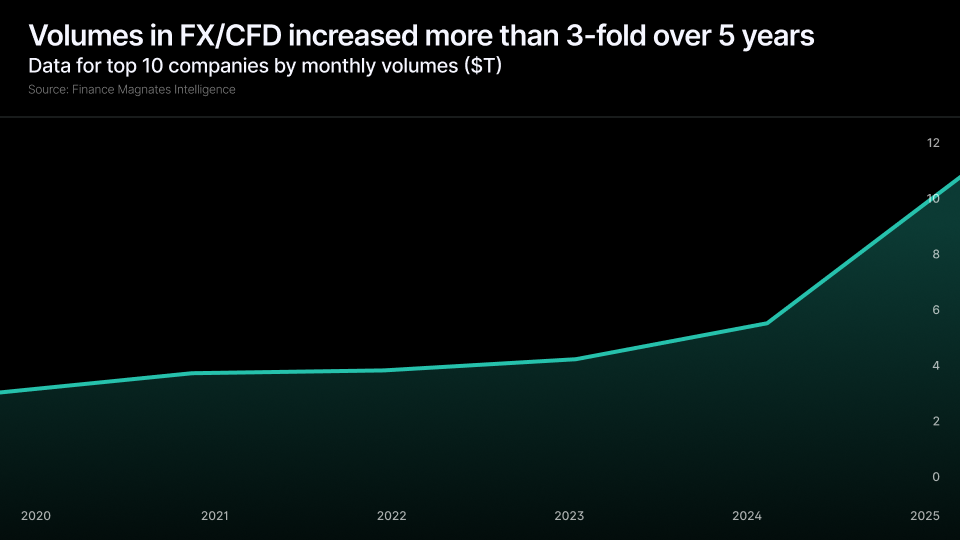 The magnitude of this expansion becomes clear when examining the pace of growth. The industry added $6.5 trillion in aggregate monthly volumes between 2023 and 2025 alone. That’s more than the entire market size just five years earlier, Finance Magnates Intelligence data shows.