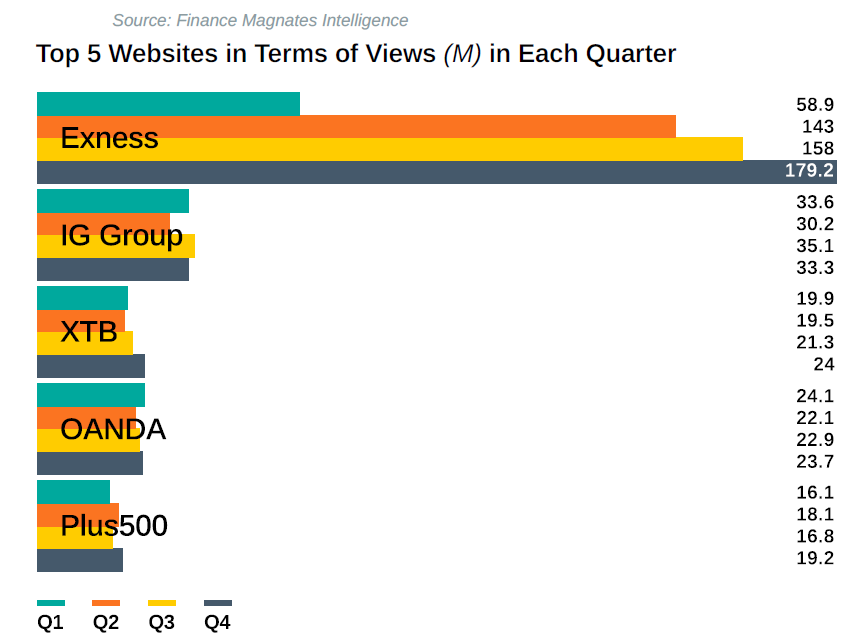 However, the standout performer was undeniably Exness, whose growth far outpaced its competitors’. Starting with 58.9 million views in Q1, Exness experienced an extraordinary surge to 143 million views in Q2. This growth continued into Q3, with 158 million views, culminating in a remarkable 179.2 million views in Q4.