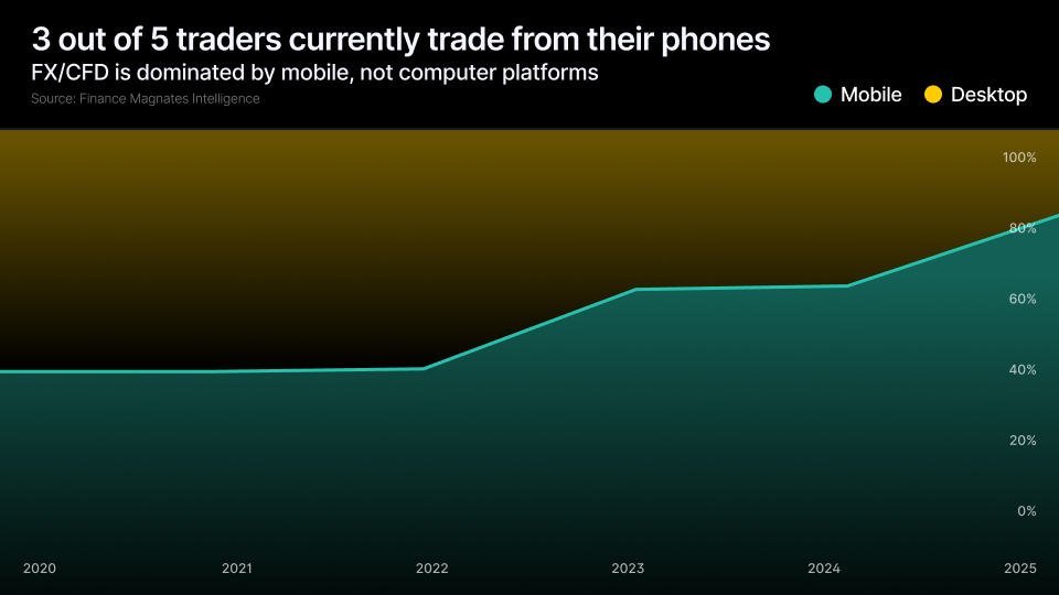 The mobile revolution crossed the 50% threshold between 2020 and 2021, earlier than the CFD takeover. By 2025, nearly two out of every three trades originated from smartphones rather than traditional desktop platforms.