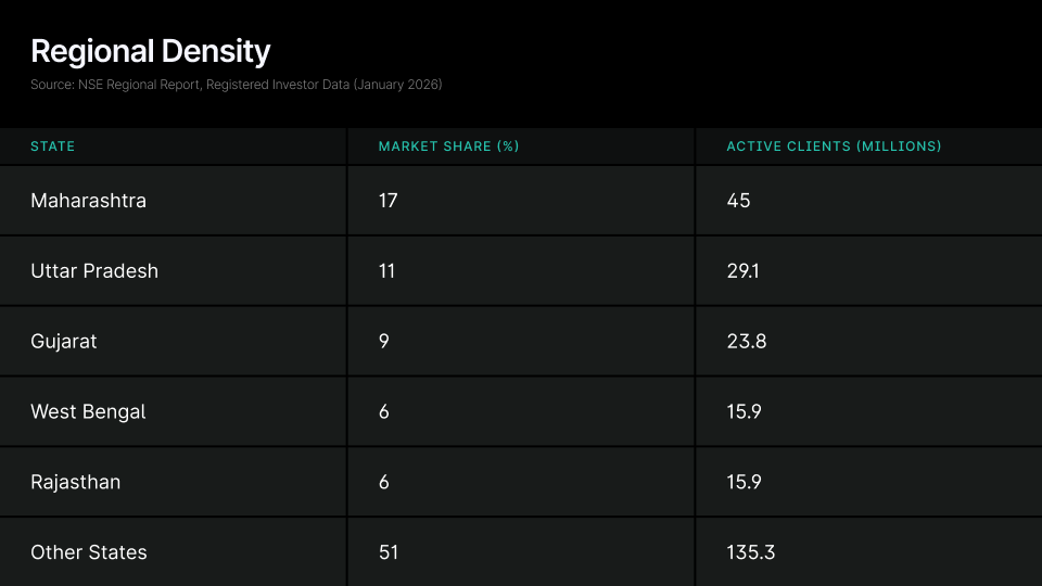Maharashtra (Mumbai and Pune) remains the undisputed leader with 17% market share, but Uttar Pradesh has leapfrogged traditional hubs to take the Number 2 spot at 11%. This suggests that a two office strategy one in GIFT City (Gujarat) for tax and regulatory reasons and one in Mumbai or Noida for client acquisition is the optimal 2026 setup. Investors in the North (UP and Rajasthan) show a 15% higher propensity for high leverage derivative trading compared to the national average.