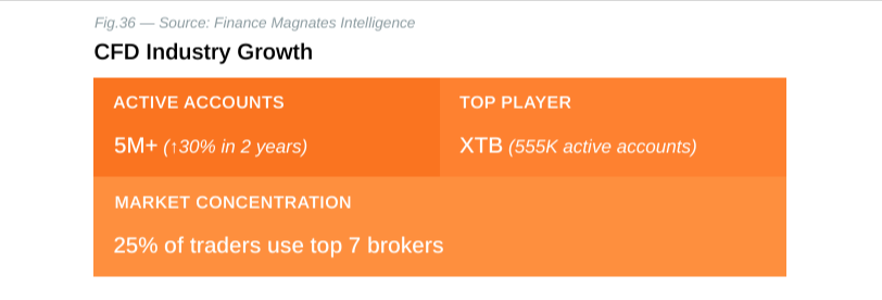 Q1 2025 saw major consolidation as FTMO acquired broker OANDA. The CFD market hit a milestone of 5M active accounts globally, led by XTB. However, market volatility due to US trade policies caused eToro to pause its IPO, and prompted a divergence in European markets, with Germany growing while France declined.
