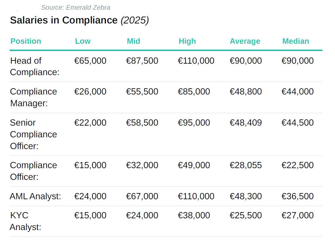 So what does this tell us? There’s a clear pay pyramid. Heads of Compliance have consolidated their position as executive peers, while analysts and officers remain at the lower end of the scale. But the sheer range, from €15,000 entry-level KYC roles to €110,000 compliance leaders, shows how brokerages must navigate a fragmented talent market.